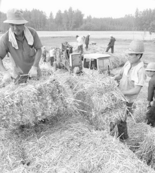 6月5日,山东省沂南县大庄镇一家麦草加工厂,农民正在将麦秸打捆装车。目前,该镇有2000多名农民常年忙于麦秸购销生意,收购的麦秸用于秸秆发电,或销往畜牧饲料加工厂。购销麦秸给他们带来可观的经济收入。