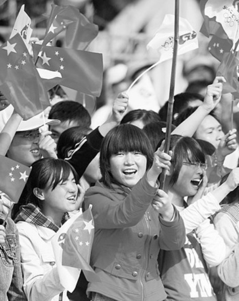 上图 6月22日,沿途群众为圣火传递加油。当日,北京奥运会圣火在青海省格尔木传递。