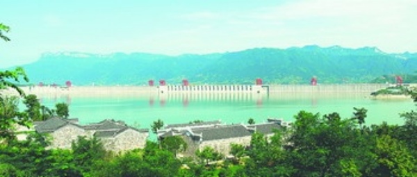 古朴的峡江民居与雄伟的三峡大坝相映生辉。(6月23日摄)