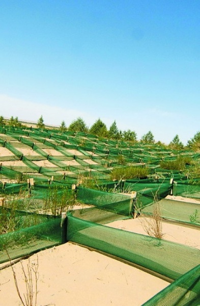 下图 这是尼龙网栅栏固沙现场。近期,青海都兰县在该县沙化严重地区使用尼龙网栅栏固沙获得成功。 新华社记者 嘎 玛摄