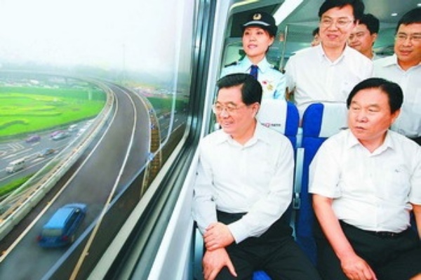 6月25日,中共中央总书记、国家主席、中央军委主席胡锦涛实地考察北京市奥运会配套交通设施。这是胡锦涛乘坐轻轨列车,实地了解北京市轨道交通发展情况。 新华社记者 鞠 鹏摄