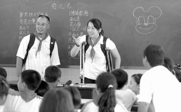 | 6月9日,奥运体操冠军李宁(左)和奥运火炬手金晶(右)在四川绵阳八一帐篷学校与学生们开展联谊活动。 新华社记者 赵颖全摄 |