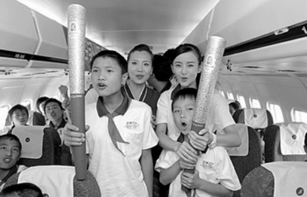 | 6月2日,89名来自四川地震灾区的儿童飞往三亚凤凰机场,开始为期15天的“爱心呵护,阳光行动”的“心灵呵护”之旅。在爱心航班上,四川地震灾区儿童和奥运火炬手曹爱(后左)、韩燕参加奥运火炬万米高空传递体验活动。