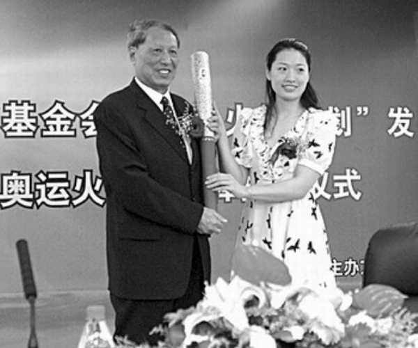 | 6月7日,雅典奥运会游泳冠军罗雪娟(右)将火炬捐献给中华思源工程扶贫基金会,用于发起灾后重建及扶贫的“爱心火炬计划”,罗雪娟出任该计划的形象大使。