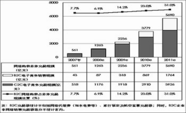 互联网调查机构艾瑞咨询最新的研究报告显示,2007年中国网络购物市场规模为561亿元,同比增长117.4%。按照最近几年的年均增速和网络购物的几何式增长,到2011年,中国网络购物市场将达到5690亿元,呈现井喷增长的态势。
