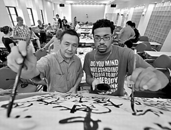 6月24日,来自美国爱荷华大学的24名北京奥运会媒体运行海外志愿者在清华大学新闻与传播学院体验中国书法。这也是为期一周的中国文化培训内容之一。 新华社记者 罗晓光摄
