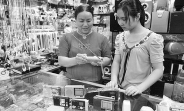 北京天成批发市场里,店家正在向顾客介绍收音机。 本报记者 乔金亮摄
