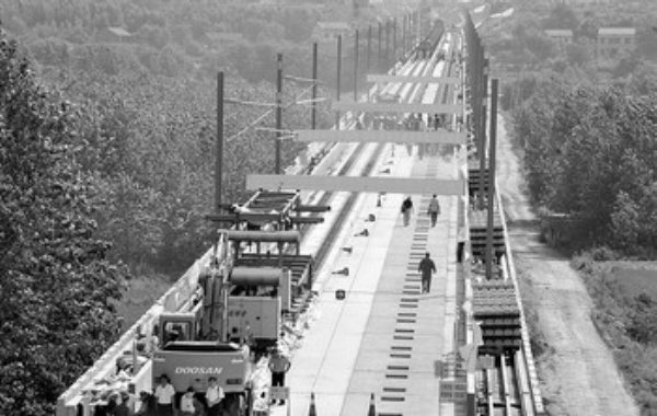 7月1日,中铁十一局施工人员在武广客运专线咸宁试验段铺设铁轨。当日,中国第一条设计最高时速350公里的铁路客运专线———武广铁路客运专线开始铺轨。 新华社记者 郝同前摄