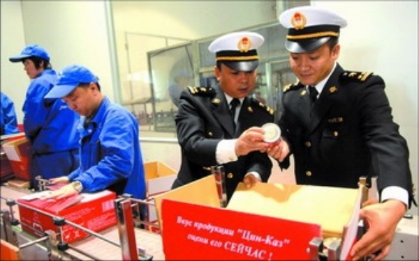 乌鲁木齐海关关员在乌鲁木齐出口加工区的中亚食品研发中心查验准备出口的罐装番茄酱。近年来,新疆采用加工贸易方式出口的番茄酱大幅增长,2007年出口量达53.3万吨,出口额3.16亿美元,与上年同期相比分别增长39.6%和59.7%,占同期全国该类产品出口总值的58.6%。