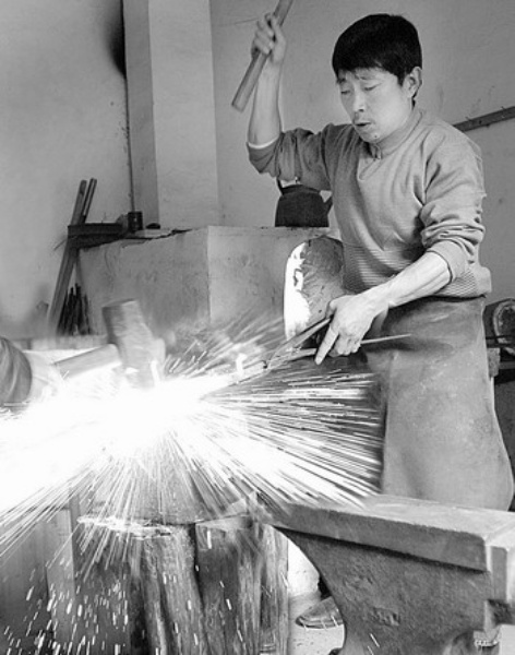 “呼!”风箱拉开,火苗蹿起,剑师陈阿金赤膊上阵,一条皮裙系在腰间,右手抽拉风箱,左手持铲拨弄火炭,炭火随之忽起忽落,师兄赵清养拄大锤候在一旁。眼见毛铁块红得通透,陈阿金迅速用钳子夹起放在铁砧板上,4斤小锤叮叮一敲,8磅大锤紧跟着落在铁块上,两锤交替紧打紧打,霎时火星四溅,铁皮剥落,整个作坊温度升高,火光映红两人胸膛。