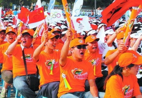 7月8日,奥运圣火的到来使呼和浩特沉浸在欢乐的气氛中,图为呼和浩特市民为奥运火炬传递加油。 本报记者 许跃芝摄