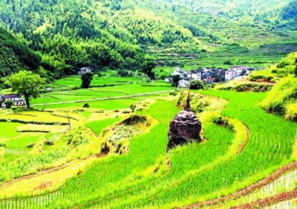 6月28日,江西婺源县农民种粮积极性高涨,20多万亩的稻田插上了秧苗,绿油油的稻田和村庄组成了一幅美丽画卷。