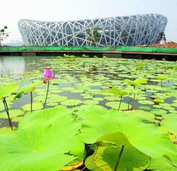 图为2007年6月28日拍摄的国家体育场“鸟巢”,南侧人工湖里的荷花含苞待放,睡莲、菖蒲等10余种植物长势良好。                       新华社发