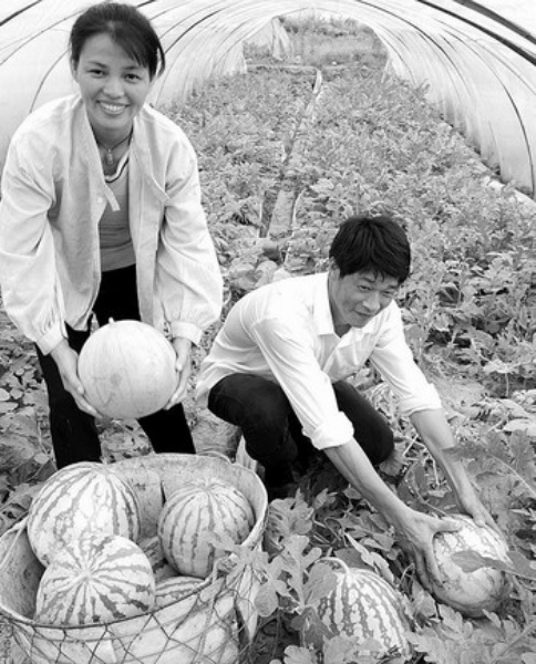 6月23日,东乡县孝岗镇西庄村于文平(右)、陈新梅夫妇在收获礼品西瓜。近年来,江西东乡县开展“婚育新风进万家”和“关爱女孩”行动,引导群众树立晚婚晚育、少生优生、男女平等的新型婚育观念。同时,把引导群众少生快富与建设现代农业结合起来,为计生户提供更加优惠的产业扶持政策,打造增收致富新渠道。 宋振平摄(新华社发)