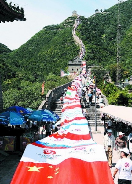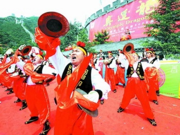 7月13日上午,北京居庸关长城。来自山西太原公交鼓乐团的员工敲起威风锣鼓,庆祝北京申奥成功七周年。当日,由中华思源工程扶贫基金会等单位主办的“奥运龙”大地艺术展在此举行。“奥运龙”长度为13112米,其中“13”代表13亿中国人民,“112”象征现代奥林匹克运动会开始112年后来到中国。 本报记者 李景录摄影报道