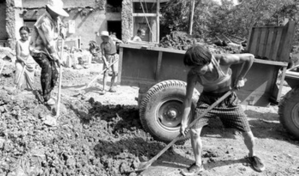 烈日下,71岁的毛培祖领着全家从农用拖拉机上卸沙土。毛培祖是陕西省汉中市宁强县舒家坝乡宝竹观村人,“5·12”汶川大地震震跨了家里的两间房子,他决心不等不靠,领着全家把房子重新修起来。废墟已经被清理干净,建筑材料正一一到位。“原来的地基还能接着用,家里劳力不少,自己就能干。”老汉说着,脸上露出笑容。