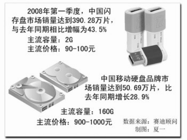 赛迪顾问数据显示,2008年第一季度,中国闪存盘市场销量达到390.28万片,与去年同期相比增幅为43.5%。