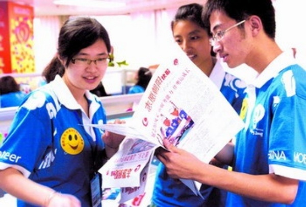 北京市朝阳区城市志愿者新闻服务团的奥运志愿者陈俊予(右一)等人正在进行探讨。 本报记者 乔金亮摄
