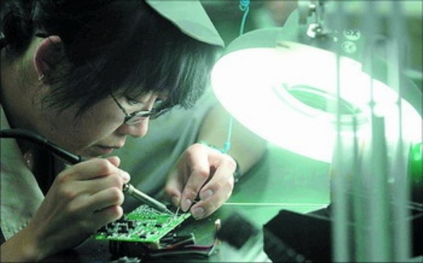 海湾安全技术有限公司装配车间,工人正在焊接作业。该公司从事消防电子、可视对讲设备的研发生产,拥有国内智能建筑电子产品最大的生产基地。大力扶持高科技、低能耗、环保型企业,是秦皇岛市实施绿色经济的举措之一。