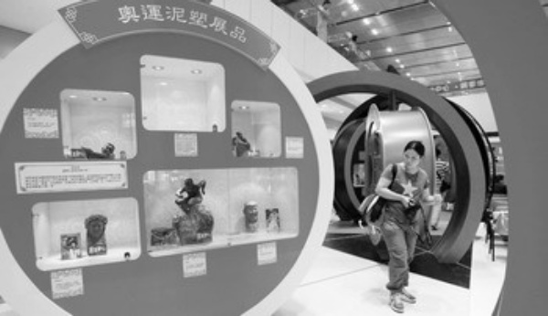 7月21日,观众在奥运五环造型的展区观看作品。当日,奥运泥塑及面塑艺术展在香港将军澳中心举行。