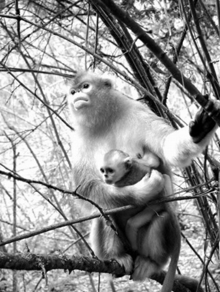 图为一对金丝猴母子在神农架大龙潭金丝猴投食点亮相。目前,神农架国家级自然保护区金丝猴数量已增加到1000多只。