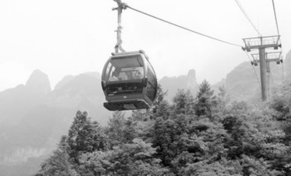 7月19日,游客乘缆车经过全长7454米、高差1277米的天门山索道登山游览。近几年来,随着天子山索道、袁家界百龙观光电梯、天门山索道以及多条旅游公路、隧道的相继建成,国际旅游城市———湖南张家界市旅游设施日臻完善,吸引了大量国内外游客,2007年入园游客达1600万人次。