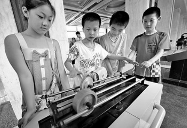 由杭州市科技交流馆举办的“科技夏令营”近日正式开营,科技交流馆免费向全市少年儿童开放。图为几名小学生在做“滚轮赛跑”实验。 新华社发