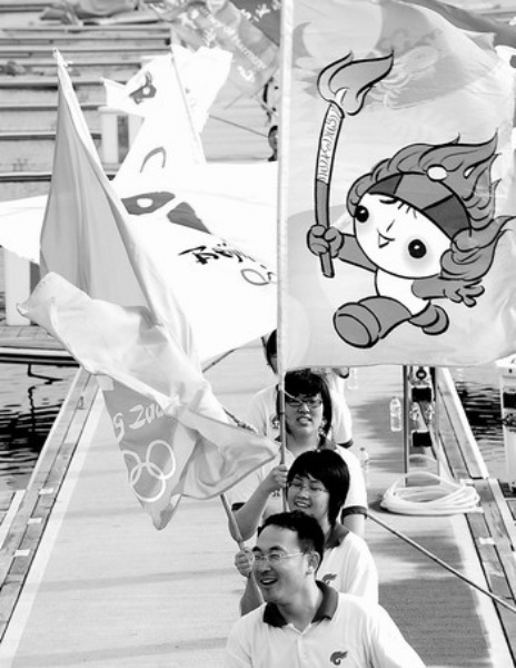 7月21日,北京奥运圣火在山东省青岛市传递。演员在奥帆中心帆船港池挥舞彩旗迎接圣火。 新华社记者 李紫恒摄