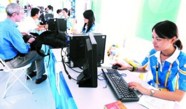 7月25日,工作人员正在为参加采访北京奥运会的中外注册记者办理登记手续。当日,北京奥运会媒体村正式开村,开始迎接参加北京奥运会报道的媒体工作人员。