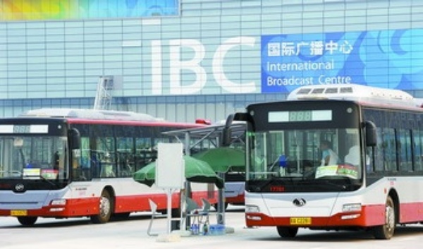 这是7月27日拍摄的位于IBC(国际广播中心)前的班车点。在2008年7月25日至8月27日期间,媒体交通系统将为前来北京采访奥运会的注册媒体人员提供交通服务。媒体交通系统将连接在北京的全部竞赛场馆、全部官方指定媒体酒店、两个媒体村、主新闻中心(MPC)、国际广播中心(IBC)、首都国际机场以及两个京外城市的竞赛场馆(天津和秦皇岛)。