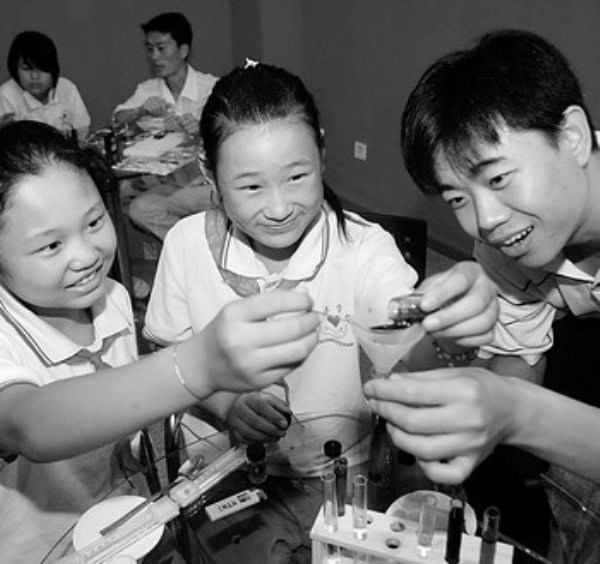 7月18日,北京朝阳区一家少儿活动中心,老师带领小学生做趣味实验。当天,北京小学生暑期快乐环保行动在京启动,活动包括向全市部分城区、郊区小学发放环保知识手册,开展趣味实践活动等,旨在提高北京市小学生的节能环保意识。