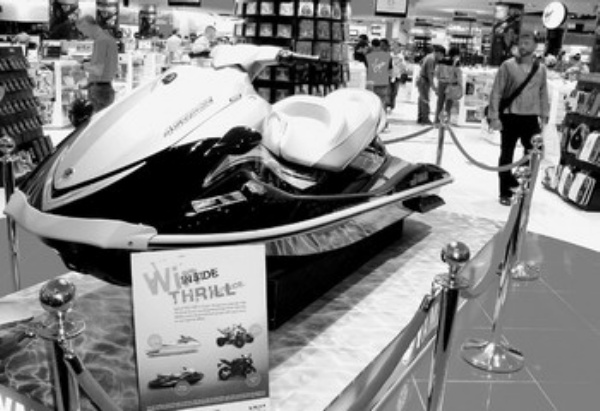 随着近年来本国民众生活质量的大幅提升,阿联酋国内文艺演出、电影电视制作及图书音像发行等文化产业空前繁荣,各类影音视听产品零售店如雨后春笋般涌现,行业竞争日渐激烈,规模连锁化经营发展趋势显著。图为当地一家大型音像制品连锁店策划推出的夏日豪华摩托艇惊喜抽奖活动吸引了许多游客前来惠顾。