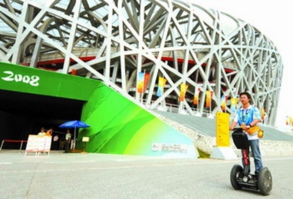 7月30日,志愿者脚踩“风火轮”在“鸟巢”工作。“鸟巢”共配备了20多部电动“风火轮”,大大提高了工作效率。新华社记者 姜恩宇摄