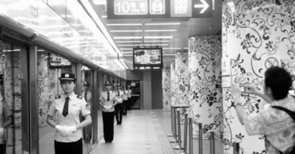 奥运前夕,北京地铁10号线一期、机场线和奥运支线三条新地铁线路同时开通运营。图为青花瓷装饰风格的地铁奥运支线北土城站。 本报记者 赵 晶摄