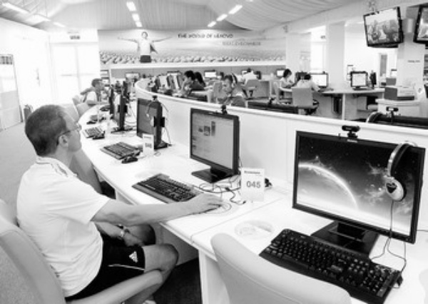 北京奥运村内,由联想集团建设运营的网吧颇受各国运动员欢迎。这家网吧为来自全球的运动员及裁判员、教练员提供便捷的网上信息服务。 本报记者 李景录摄