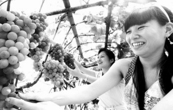 7月28日,重庆市永川区葡萄协会会员郑清的葡萄园里,市民在采摘玫瑰香葡萄。葡萄果色鲜艳、果味香甜,因此深受市民青睐。 陈仕川摄(中经网供图)