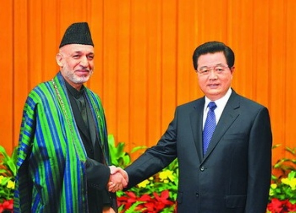 胡锦涛在会见阿富汗总统卡尔扎伊时表示,中阿两国有着传统友谊和良好关系。中方愿同阿方一道,积极落实《中阿睦邻友好合作条约》,推动中阿全面合作伙伴关系向前发展。胡锦涛指出,中方尊重阿富汗主权、独立和领土完整,尊重阿方自主选择的发展道路,支持阿方为维护本国安全稳定所做的努力。中方重视并积极参与阿富汗重建进程,并愿提供力所能及的支持。中国政府将继续鼓励有实力的企业参与阿富汗资源开发和基础设施建设,促进阿富汗经济社会发展。