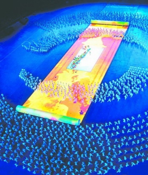 鸟巢中央场地,平坦如一张巨大的书案,案上一卷中国古代形制的画轴缓缓打开,一张白纸铺在画卷中央。