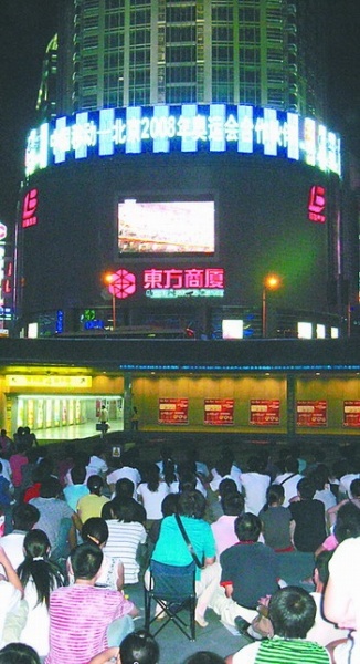 8月8日晚,上海市民在五角场环岛广场上观看北京奥运会开幕式。 本报记者 李治国摄