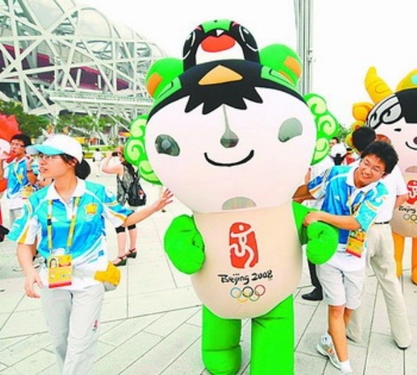 8月8日,志愿者、游人纷纷与充气“福娃”合影留念。 新华社记者 徐 昱摄