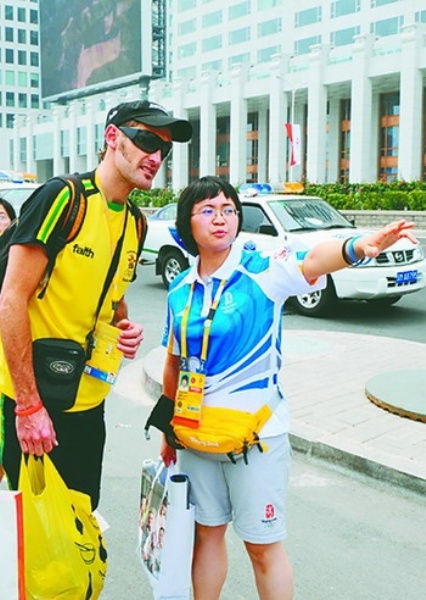 8月8日,志愿者为外国游客指路。 新华社记者 李紫恒摄