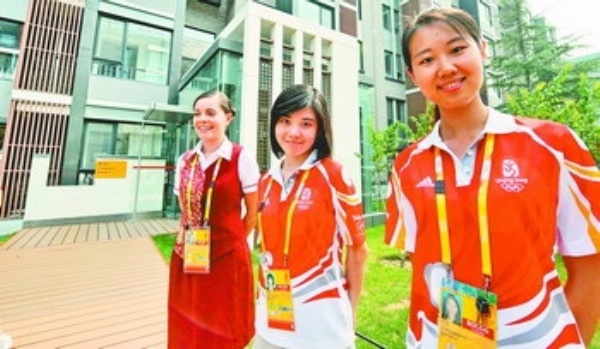 图为志愿者在北京奥运村运动员居住区笑迎宾客。