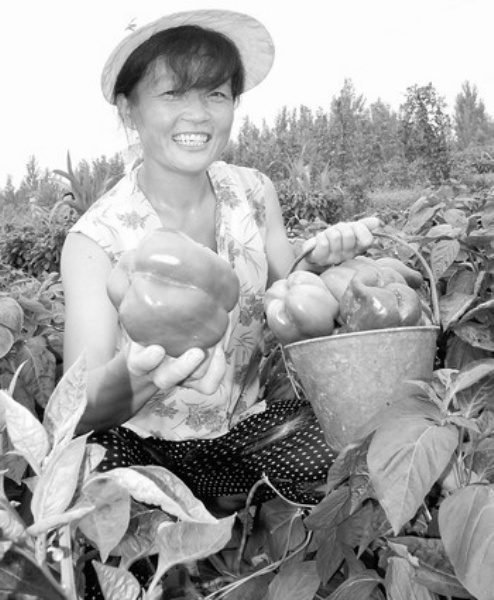 7月29日,山东滨州市滨城区王立平村农民冯洪枝正在采摘甜椒。近年来,滨城区依托水利资源丰富的优势,引导群众发展规模化的现代农业,通过统一供种、统一技术指导和统一销售网络的逐步完善,先后发展优质果蔬15万亩。7600多户农民成为发展有机蔬菜和无公害蔬菜的规模户,户均种植优质蔬菜10多亩。 王际灵摄(中经网供图)