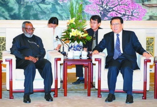 | 8月7日,中共中央政治局常委李长春在人民大会堂会见前来出席北京奥运会开幕式的纳米比亚人组党前主席、前总统努乔马。