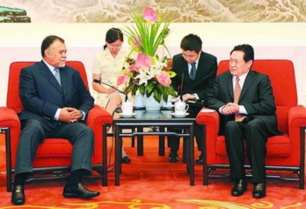 | 8月7日,中共中央政治局常委、中央政法委书记周永康在人民大会堂会见前来出席北京奥运会开幕式的沙特阿拉伯国家安全委员会秘书长班达尔亲王。