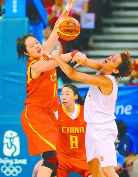 | 8月9日,中国女篮队员陈晓丽(左)在比赛中与对手拼抢。当日,北京奥运会女子篮球小组赛B组比赛中,中国女篮以67比64战胜西班牙女篮。 新华社记者 李俊东摄 |