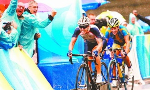 | 8月10日,英国选手库克冲线。当日,北京奥运会公路自行车女子大组赛举行,库克夺得冠军。 新华社记者 吕明响摄 |