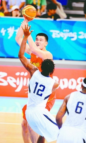 | 左图 8月10日,中国男篮队员姚明在比赛中上篮。当日,在北京奥林匹克篮球馆进行的北京奥运会男子篮球比赛小组赛中,中国队迎战美国队,最终以70∶101告负。