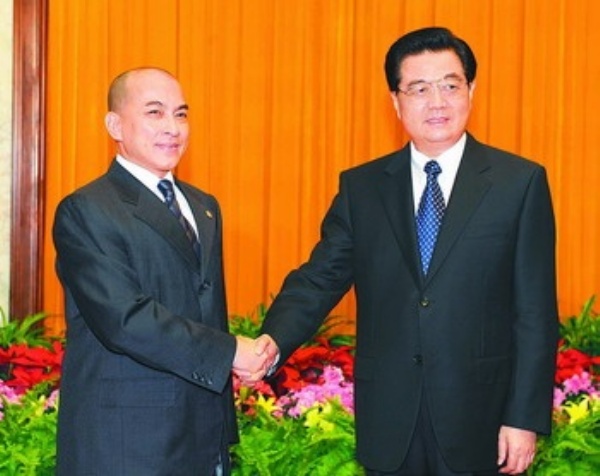 胡锦涛在会见柬埔寨国王西哈莫尼时表示,中柬是传统友好邻邦,两国人民的友谊源远流长。中柬友好关系经历了国际风云变幻和各自国内情况变化的考验,始终健康发展,日益深入人心。中柬不仅是和睦相处的好邻居,更是真诚互信的好朋友、同甘共苦的好兄弟、合作共赢的好伙伴。中柬友好关系堪称不同社会制度国家平等相待、真诚合作的典范。柬埔寨王室高度重视对华关系,为中柬关系发展作出了杰出贡献,我们对此表示高度赞赏。中国政府和人民愿同柬埔寨政府和人民一道,以中柬建交50周年为契机,加强友好往来,扩大互利合作,促进共同发展,推动中柬睦邻友好和全面合作再上新台阶。