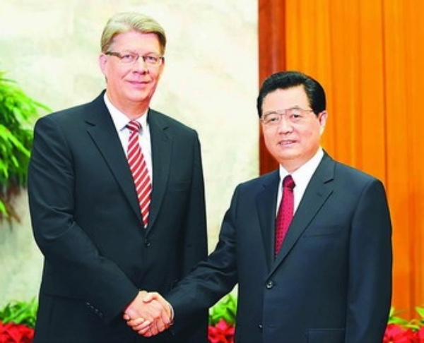 8月11日,国家主席胡锦涛在人民大会堂会见来华出席北京奥运会开幕式及相关活动的拉脱维亚总统扎特莱尔斯。 新华社记者 饶爱民摄